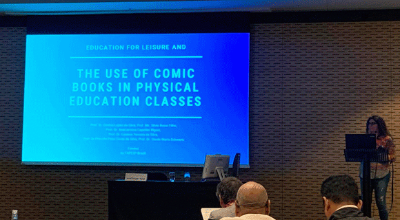 This project aims at the creation of a new comic book application for Elementary Physical Education classes, with the purpose of education for leisure. An existing app developed by Prof. Dr. Cláudio Kirner, called Flaras, was adapted for this project. This research was composed by bibliografic and field research (qualitative studies). Two pedagogical experiences were done in an Elementary/Junior High education public school in Piracicaba city/SP/Brazil. Both pedagogical experiences were considered effective for Physical Education classes and education for leisure. The students showed positive views about dance, sports, games, gym, fight, elements of body culture.